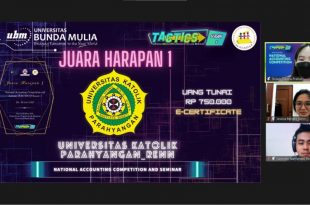 Tim Lomba Program Studi Akuntansi Universitas Katholik Parahyangan yang diwakilkan oleh Tim “Newbiez” yang beranggotakan Milka Prasetya Terutama (2017130032), Natasha Dirdjosapoetro (6041801050), Lulu Carissa Soegiharto (6041801109) berhasil meraih Juara 2 dalam acara Atma Jaya Yogyakarta Supreme Accounting Competition (ASAC) 2021 tingkat nasional yang diselenggarakan secara daring pada tanggal 25-26 Maret …