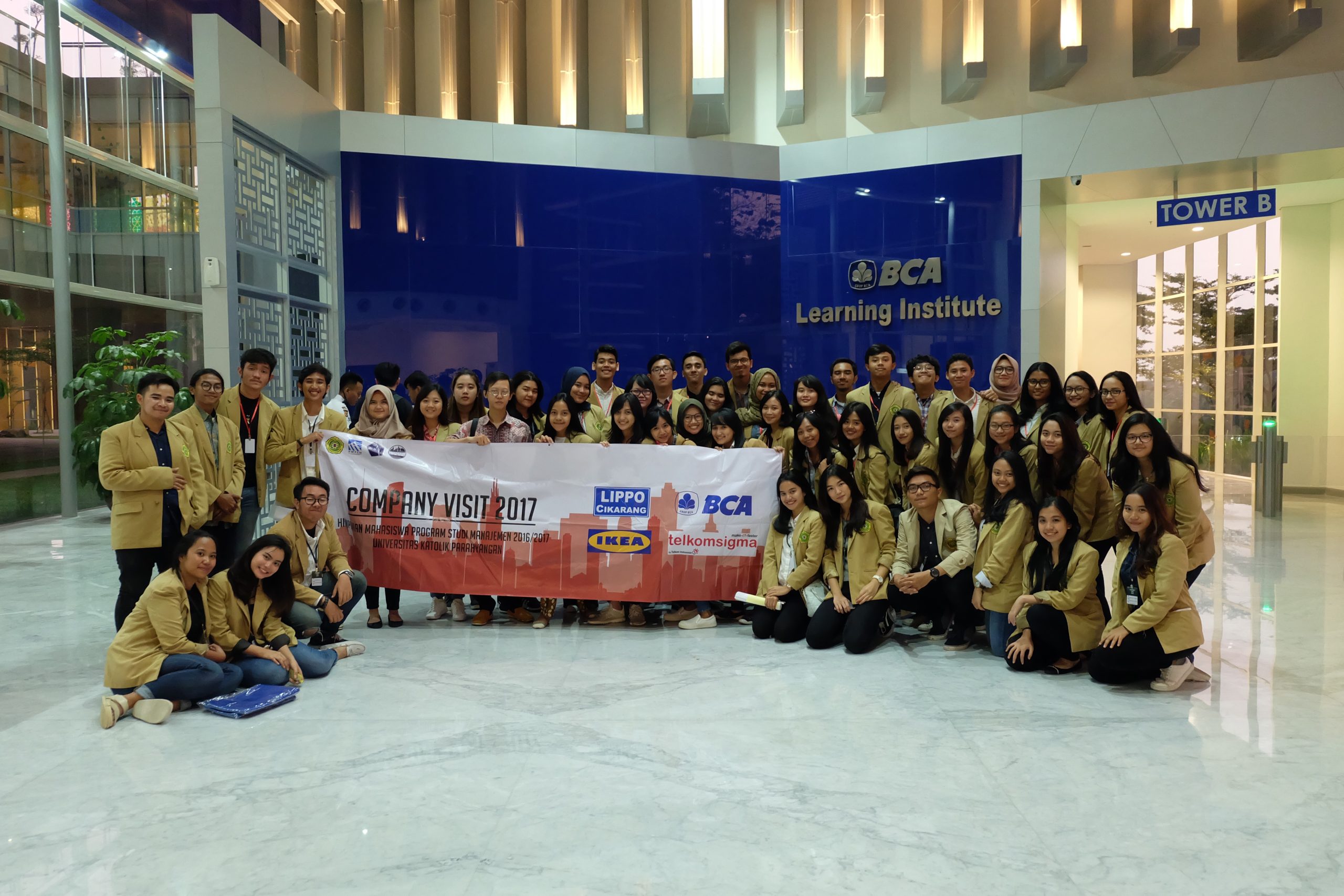 Perjalanan lalu dilanjut menuju BCA Learning Institute yang dimulai pada pukul 11.15 WIB, para peserta tiba di BCA Learning Institute pada pukul 13.35 WIB. Peserta Company Visit 2017 memasuki lobby untuk dibagi menjadi 3 kelompok, setelah dibagi kelompok dan mendapatkan mentornya masing-masing dari pihak BCA, peserta menuju ruang ballroom BCA Learning Institute. Acara resmi dimulai pukul 13.55 WIB yang dibuka oleh MC dari pihak PT. Bank Central Asia Tbk (BCA) untuk menyambut peserta Company Visit 2017 di ballroom. Acara dibuka dengan kata sambutan dari Ibu Vera selaku … PT. Bank Central Asia Tbk (BCA) dan penyerahan plakat dari kedua belah pihak. Setelah rangkaian sambutan dan penyerahan plakat, acara dilanjutkan dengan presentasi dari Ibu Vera berupa sejarah BCA dan materi mengenai manajemen keuangan, lalu dilanjutkan dengan sesi tanya jawab untuk para peserta Company Visit 2017 hingga pukul 15.30 WIB. Setelah presentasi dan sesi tanya jawab, peserta dipersilahkan untuk isoma (istirahat, shalat, dan makan) selama ± 30 menit, lalu dilanjutkan dengan sesi touring di BCA Learning Institute. Tempat yang dituju selama touring yaitu ruang mini customer service dan teller, perpustakaan, dan galeri BCA yang berjalan dimulai pukul 16.00 WIB dan selesai pada pukul 17.30 WIB. Setelah itu dilanjut dengan acara penutupan yaitu foto bersama di lobby BCA Learning Institute. Perjalanan lalu dilanjut menuju hotel Nite & Day Residence Alam Sutera yang dimulai pada pukul 18.00 WIB dan tiba di hotel Nite & Day Residence Alam Sutera pada pukul 20.00 WIB untuk beristirahat.