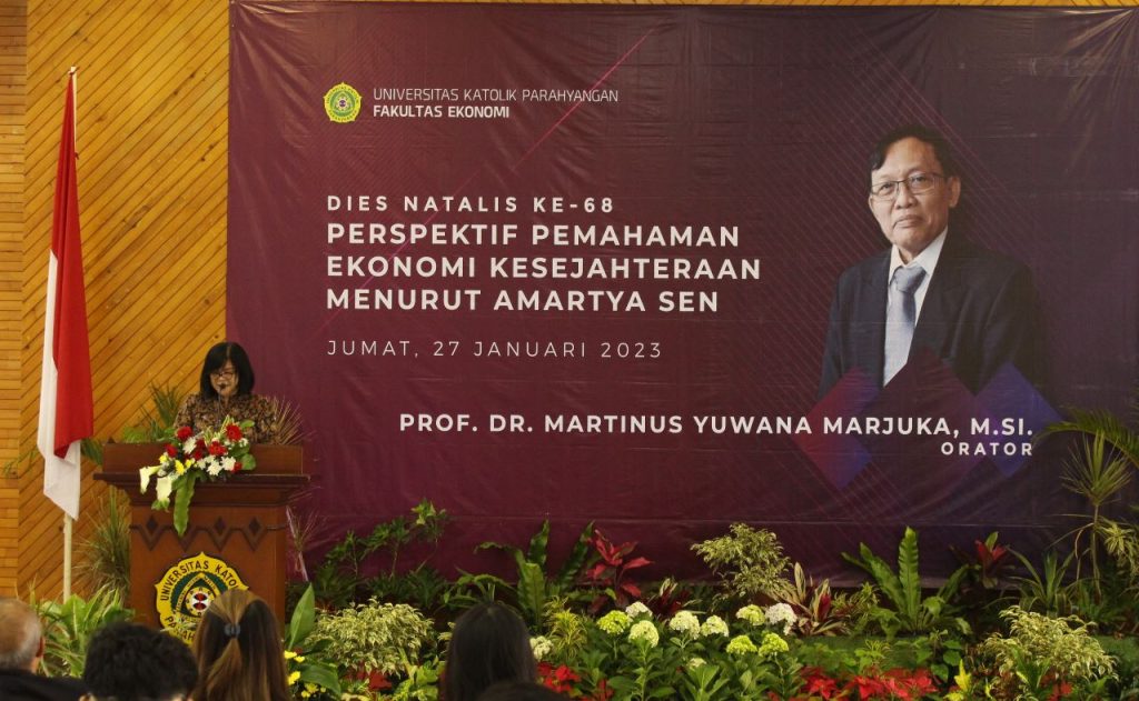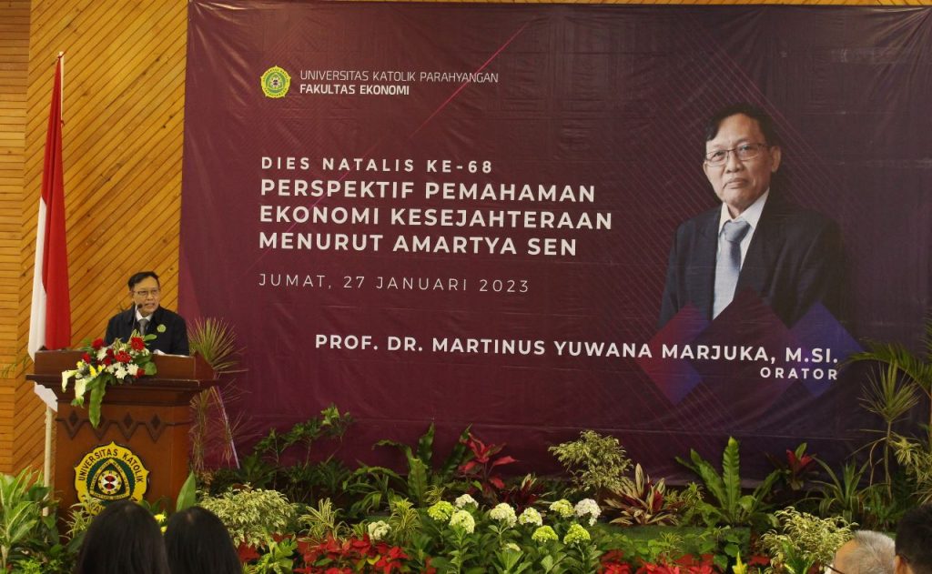 Dalam kegiatan Dies Natalis ke 68 FE Unpar disampaikan orasi ilmiah oleh Prof. Dr. M. Yuwana Marjuka dengan tema Perspektif Pemahaman Amartya Sen Tentang Ekonomi Kesejahteraan. Amartya Sen (peraih Nobel 1998) dikenal sebagai ekonom yang pemikiran-pemikirannya dilihat sebagai titik-temu ilmu ekonomi, matematika, epistemologi dan filsafat moral. Pemikiran yang interdisipliner tersebut menjadi pilar (referensi utama) kajian ekonomi kesejahteraan yang kontribusinya meningkatkan pemahaman tentang mekanisme terbentuknya pemahaman komprehensif ekonomi kemiskinan. Amartya Sen merestorasi dimensi etik dari teori-teori ekonomi neo-klasik dengan konsep hak individu dan akses informasi sebagai ukuran kesejahteraan individual. Teori yang dikembangkannya terdiri dari teori pilihan sosial (social choice theory), teori ekonomi kesejahteraan (welfare economics), teori keadilan, kebebasan dan capability theory (kapabilitas), teori pengukuran (measurement theory), dan ekonomi pembangunan (development economics). Isu-isu lain yang juga menjadi perhatiannya antara lain pengukuran kemiskinan dan deprivasi keberdayaan (capability deprivation), ketidakadilan (relasi asimetris) ekonomi serta perbantuan pemerintah untuk pemecahan masalah diprivasi kemiskinan serta kelaparan (famine).