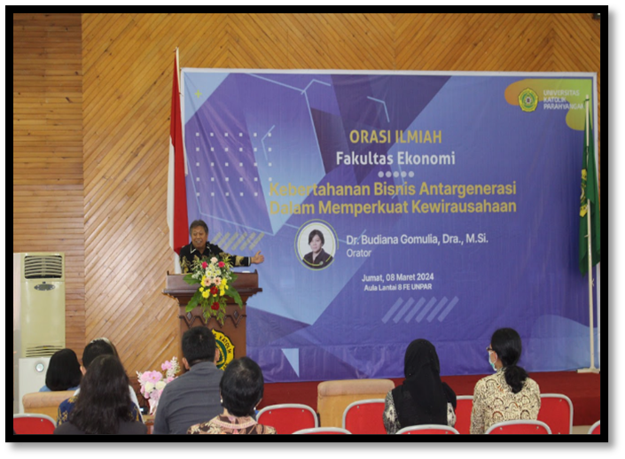 Bandung, Jumat, 8 Maret 2024 Fakultas Ekonomi Universitas Katolik Parahyangan melaksanakan acara Orasio Ilmiah dengan judul Kebertahanan Bisnis Antargenerasi Dalam Memperkuat Kewirausahaan(Nasional) acara mulai pukul 09.00 dibuka oleh pembawa acara bapak Antonius Chandra L.K., A.Md. dan ibu Deba Luthfia, S.E., M.A.B. di awali dengan doa pembukaan oleh bapak Antonius Chandra L.K., A.Md. lalu bersama-sama menyanyikan lagu Indosesia Raya, Hymne UNPAR dan Mars FE yang dipimpin oleh Paduan Suara Mahasiswa UNPAR.