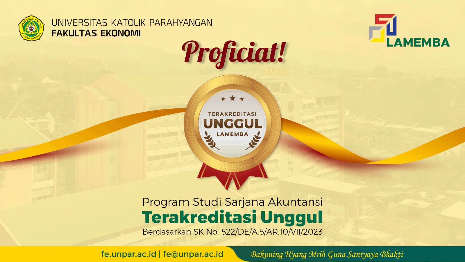 Puji syukur kami panjatkan ke hadirat Tuhan yang Maha Esa atas keberhasilan Program Studi Sarjana Akuntasi Fakultas Ekonomi Universitas Katolik Parahyangan (FE UNPAR) yang mempertahankan status akreditasi A dari BAN-PT menjadi akreditasi UNGGUL dari Lembaga Akreditasi Mandiri Ekonomi, Manajemen, Bisnis dan Akuntansi (LAMEMBA), dengan SK No. 522/DE/A.5/AR.10/VII/2023 berlaku mulai 17 Juli 2023 sampai dengan 17 Juli 2028.